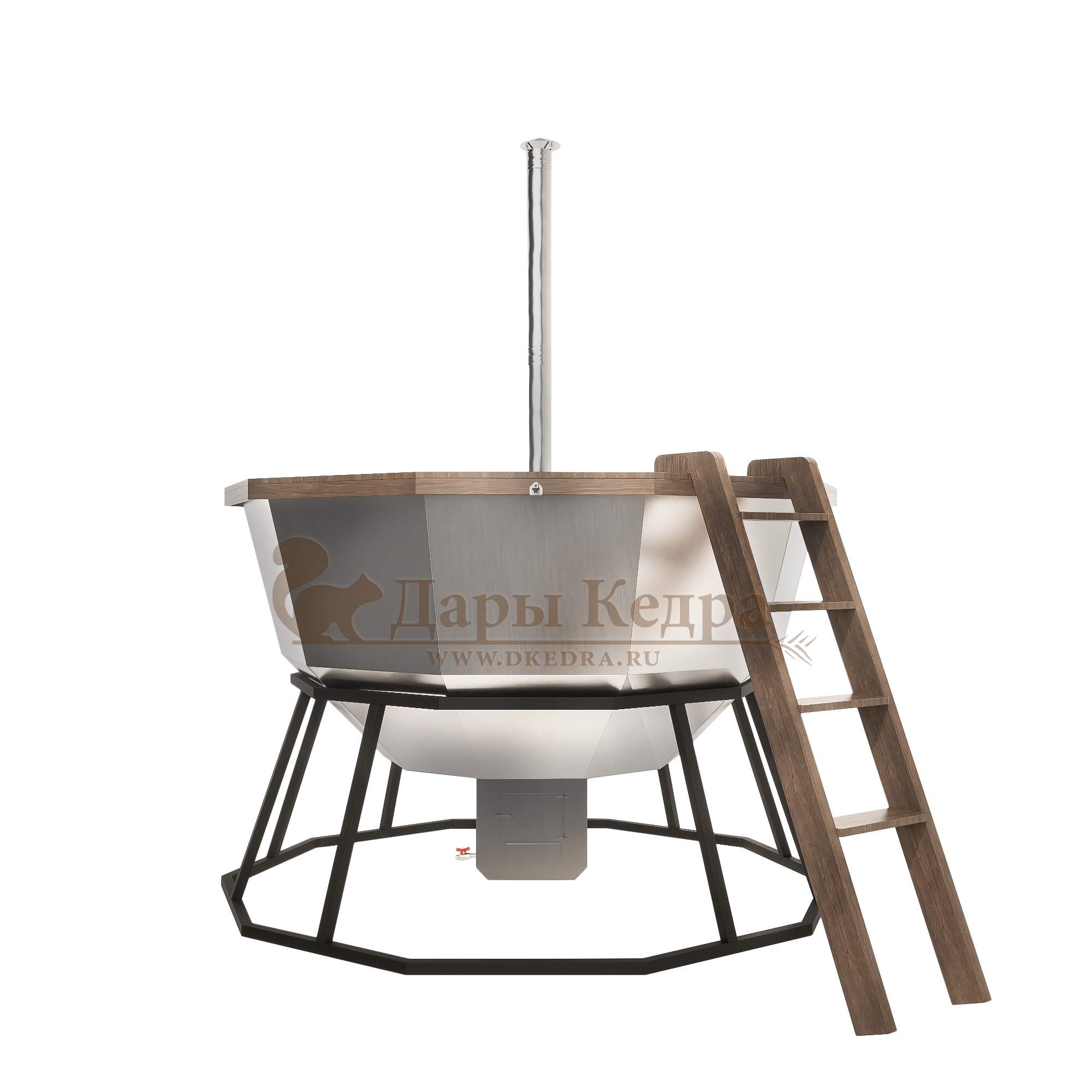 Банный чан из нержавеющей стали Ø-2350 на подставке с приставной печью Банный чан с приставной печкой изготовлен из пищевой стали. Представляет собой большую ёмкость в виде чаши, при нагревании которой можно париться на свежем воздухе. Чан установлен на устойчивую металлическую подставку и оснащен приставной печью с дымоходом. Банный чан оборудован кедровым бортом, скамейками, подспинниками, трапом для ног и приставной лестницей.