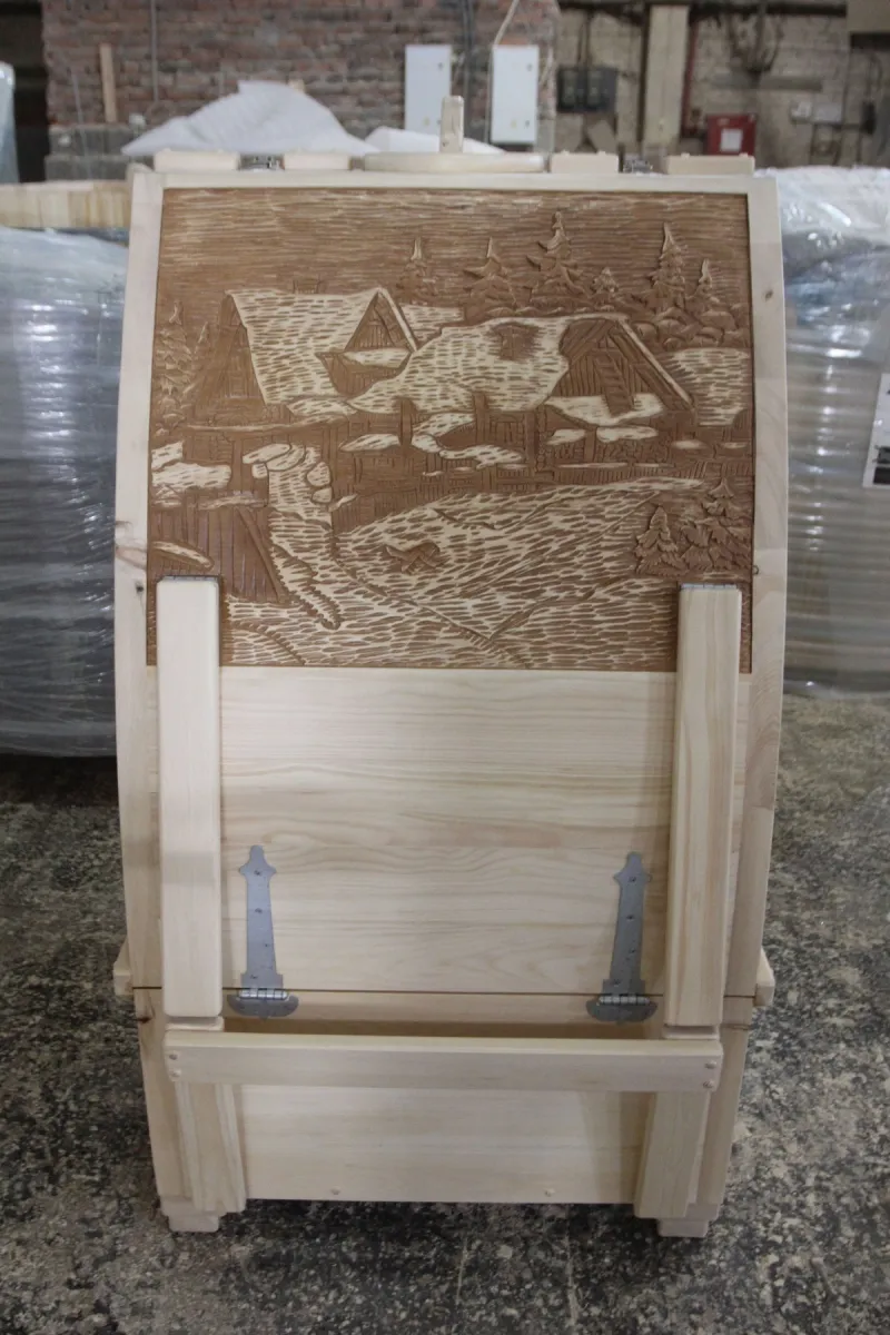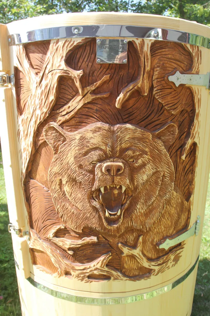 Резьба на дверце кедровой бочки