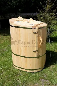 Готовый комплект - это полностью укомплектованный набор с фитобочкой для процедур парения. Овальная модель более просторна и удобна в использовании. Толщина стенок составляет 25 мм. Бочка оборудована откидными створками, дверцей и отверстием для головы. Верхний скос изделия делает положение головы более комфортным и улучшает обзор. Во время парения человек сидит внутри кедровой бочки, а голова находится снаружи. Благодаря этому исключается возможность перегрева. Подлокотники из кедра, встроенные ручки на створках и двери делают эксплуатацию более удобной.